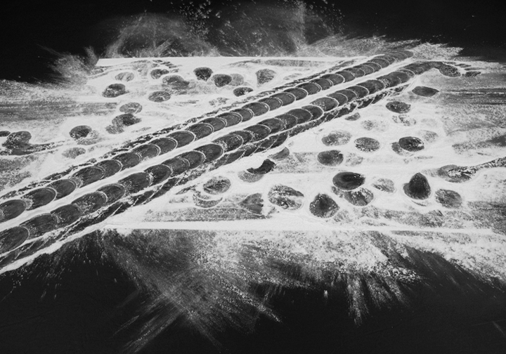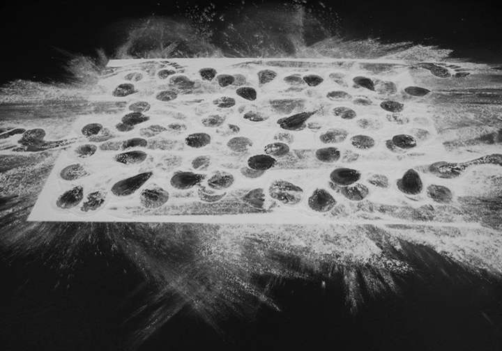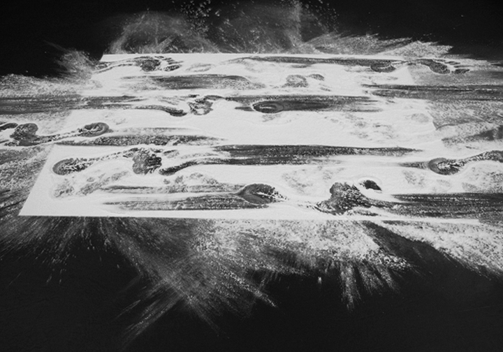 J’effectue dans un rectangle de poudre blanche diverses traversées en empruntant les pas à un vocabulaire de base de danse. Au fur et à mesure des passages, la forme géométrique s’abîme pour à la fin disparaître tout à fait.